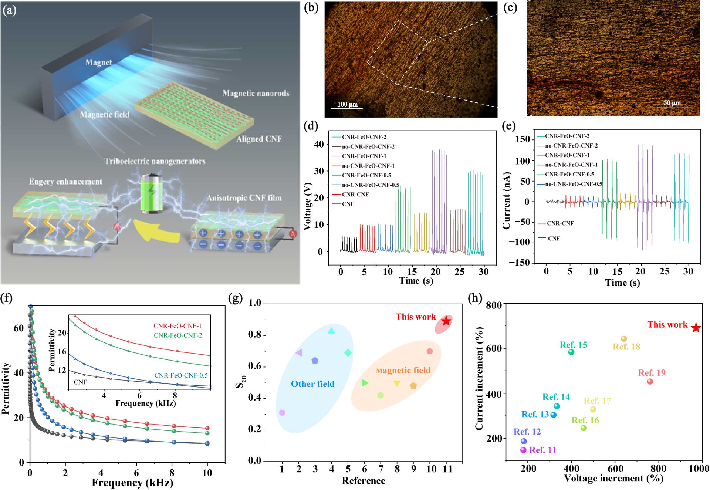 圖(a)磁場(chǎng)誘導(dǎo)磁性納米棒取向納米纖維素提高TENG輸出性能示意圖;(b)、(c)高度排列納米纖維素偏光顯微鏡圖;(d)、(e)磁場(chǎng)取向納米纖維素與隨機(jī)分布納米纖維素構(gòu)成TENG輸出性能圖;(f)各向異性納米纖維素膜介電常數(shù)圖;(g)以磁性納米棒誘導(dǎo)CNF取向與傳統(tǒng)非磁場(chǎng)取向和磁場(chǎng)取向CNF的S2D對(duì)比圖;(h)以磁場(chǎng)誘導(dǎo)高度取向的CNF與其他增強(qiáng)TENG輸出性能方法的性能提升幅度對(duì)比圖