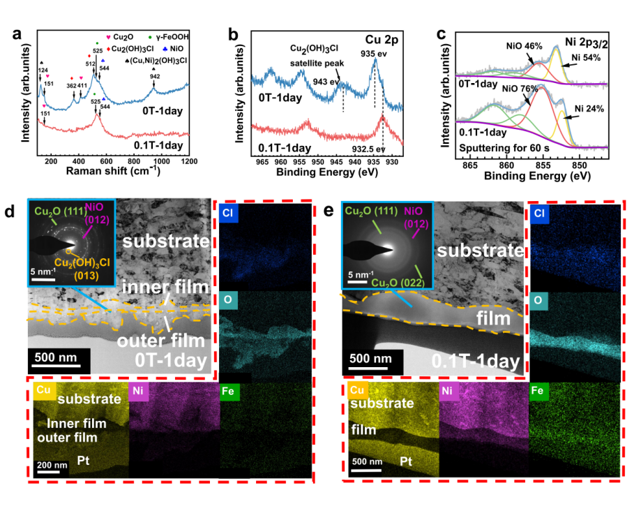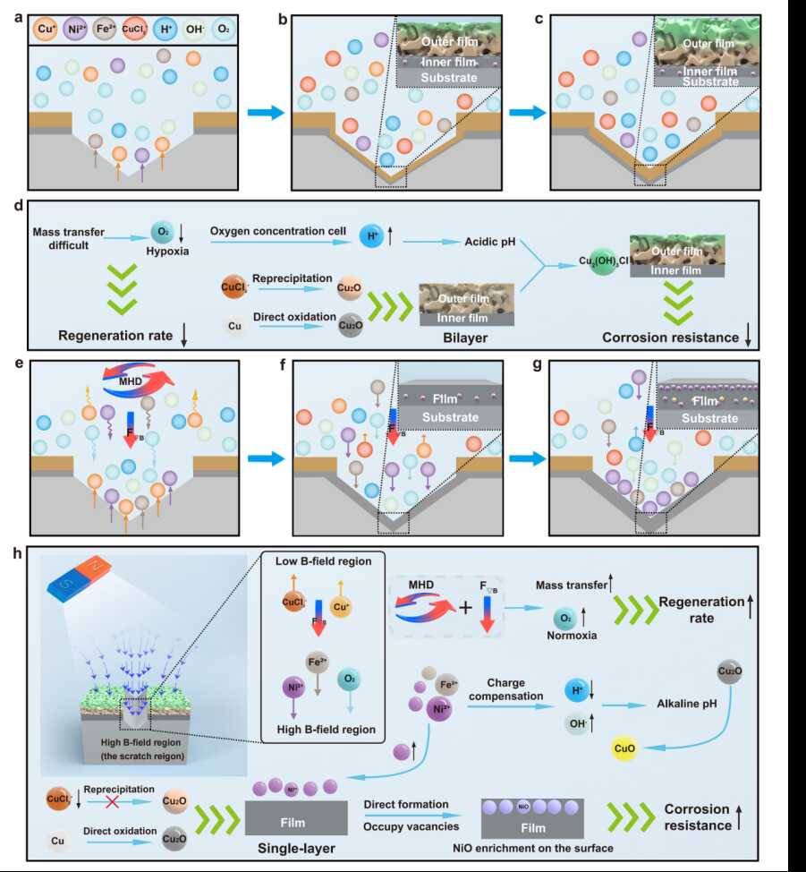 研究發(fā)現(xiàn),磁場(chǎng)的施加會(huì)產(chǎn)生兩種作用力:(1)洛倫茲力驅(qū)動(dòng)對(duì)流:磁場(chǎng)通過(guò)洛倫茲力誘導(dǎo)磁流體動(dòng)力學(xué)效應(yīng),如同“無(wú)形攪拌”,加速了物質(zhì)傳輸和氧氣向劃傷區(qū)的補(bǔ)充,促進(jìn)了修復(fù)初期的成膜反應(yīng)。(2)磁梯度力精準(zhǔn)分選:損傷區(qū)域的磁通密度增加,促使順磁性離子向劃痕內(nèi)部移動(dòng),導(dǎo)致劃傷區(qū)局部pH值升高,加速了Ni2?在表面富集并形成高保護(hù)性的NiO。在兩種作用力的協(xié)同作用下,實(shí)現(xiàn)了銅鎳合金氧化膜損傷后快速修復(fù),且具有以下優(yōu)點(diǎn):(1)修復(fù)加速:掃描振動(dòng)電極技術(shù)測(cè)試顯示,在磁場(chǎng)作用下,劃傷區(qū)域的電化學(xué)反應(yīng)信號(hào)迅速減弱,9天后其電流密度甚至低于周圍完好區(qū)域,表明再生膜的抗腐蝕性已優(yōu)于原始完好膜層。(2)結(jié)構(gòu)優(yōu)化:無(wú)磁場(chǎng)條件下,再生膜為常見(jiàn)的雙層結(jié)構(gòu),外層是抗蝕性較差的堿式氯化銅,且覆蓋不均。而在磁場(chǎng)下,再生膜形成了一層均勻、致密的單層結(jié)構(gòu)。(3)成分升級(jí):磁場(chǎng)抑制了外層堿式氯化銅的沉積,同時(shí)顯著促進(jìn)了NiO在氧化膜表面的富集。這種“表面富NiO的單層膜”結(jié)構(gòu)此前從未被報(bào)道,正是其耐蝕性躍升的關(guān)鍵。
